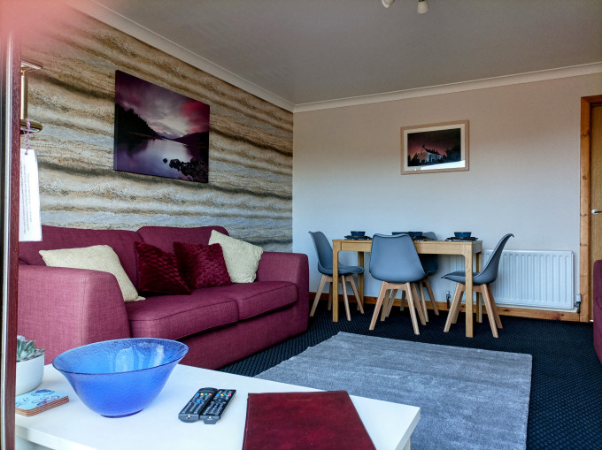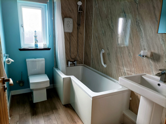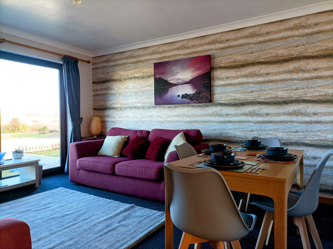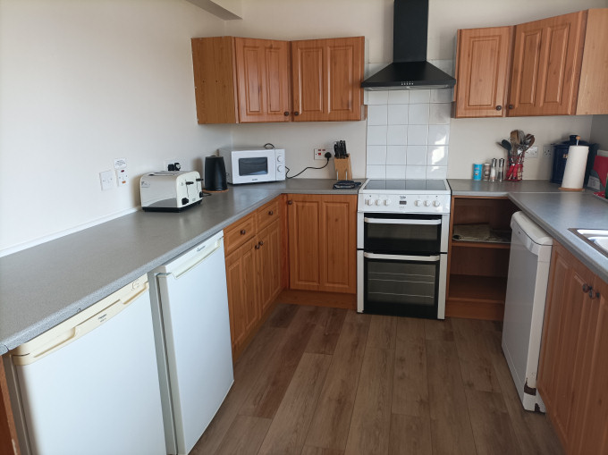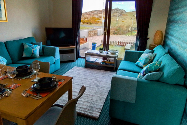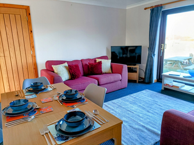 Downstairs, leading off the entrance hallway is the lounge/dining room with comfortable sofas, coffee table, dining table and TV with satellite reception offering a good range of channels including radio. Additionally the TV is equipped with a DVD player. A selection of board games is available. A large sliding-window opens out on to the small grassed sitting area providing views to the north to Tor Mor.